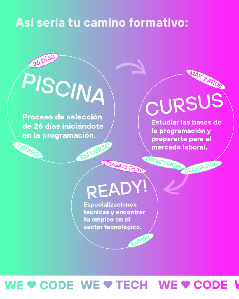 La piscina es un proceso intensivo de 26 días presenciales en el que las personas interesadas en formar parte de 42 se enfrentan a desafíos diarios y proyectos de programación. Es una oportunidad para demostrar si el método de aprendizaje de esta comunidad encaja con la forma en que cada quien aprende, sin necesidad de conocimientos previos ni clases tradicionales. Este período busca evaluar habilidades como la toma de decisiones, la resolución de problemas en equipo y la motivación, todo en un entorno dinámico, gamificado y sin profesores.
